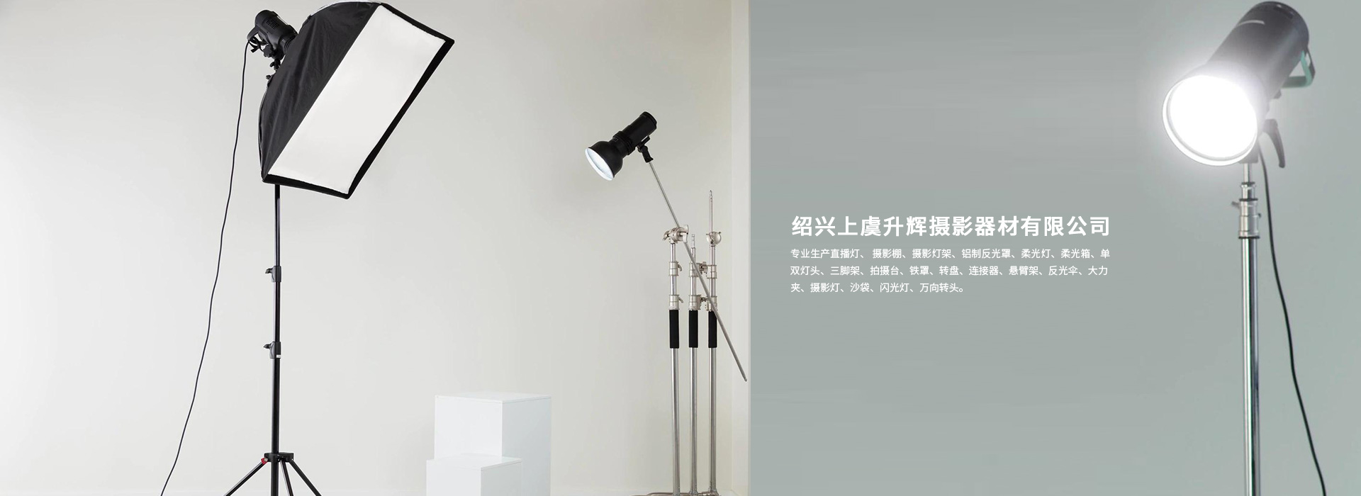紹興上虞升輝攝影器材有限公司專業生產直播燈、 攝影棚、攝影燈架、鋁制反光罩、柔光燈、柔光箱、單雙燈頭、三腳架、拍攝臺、鐵罩、轉盤、連接器、懸臂架、反光傘、大力夾、攝影燈、沙袋、閃光燈、萬向轉頭。